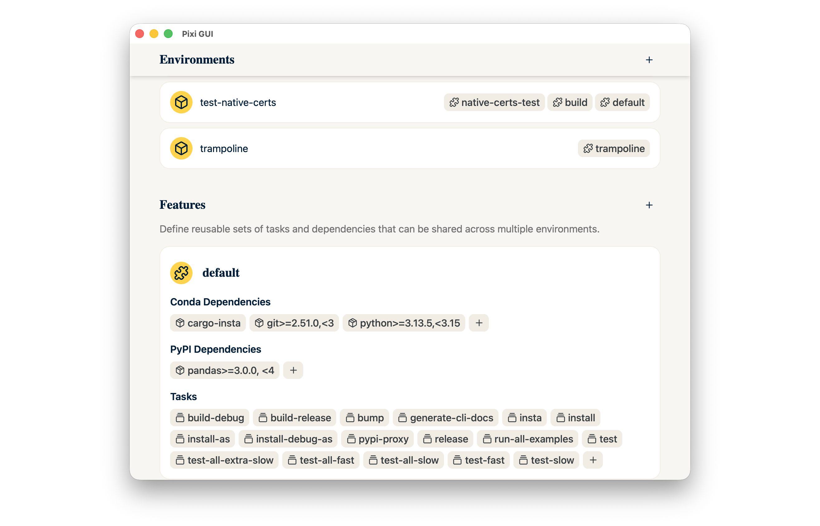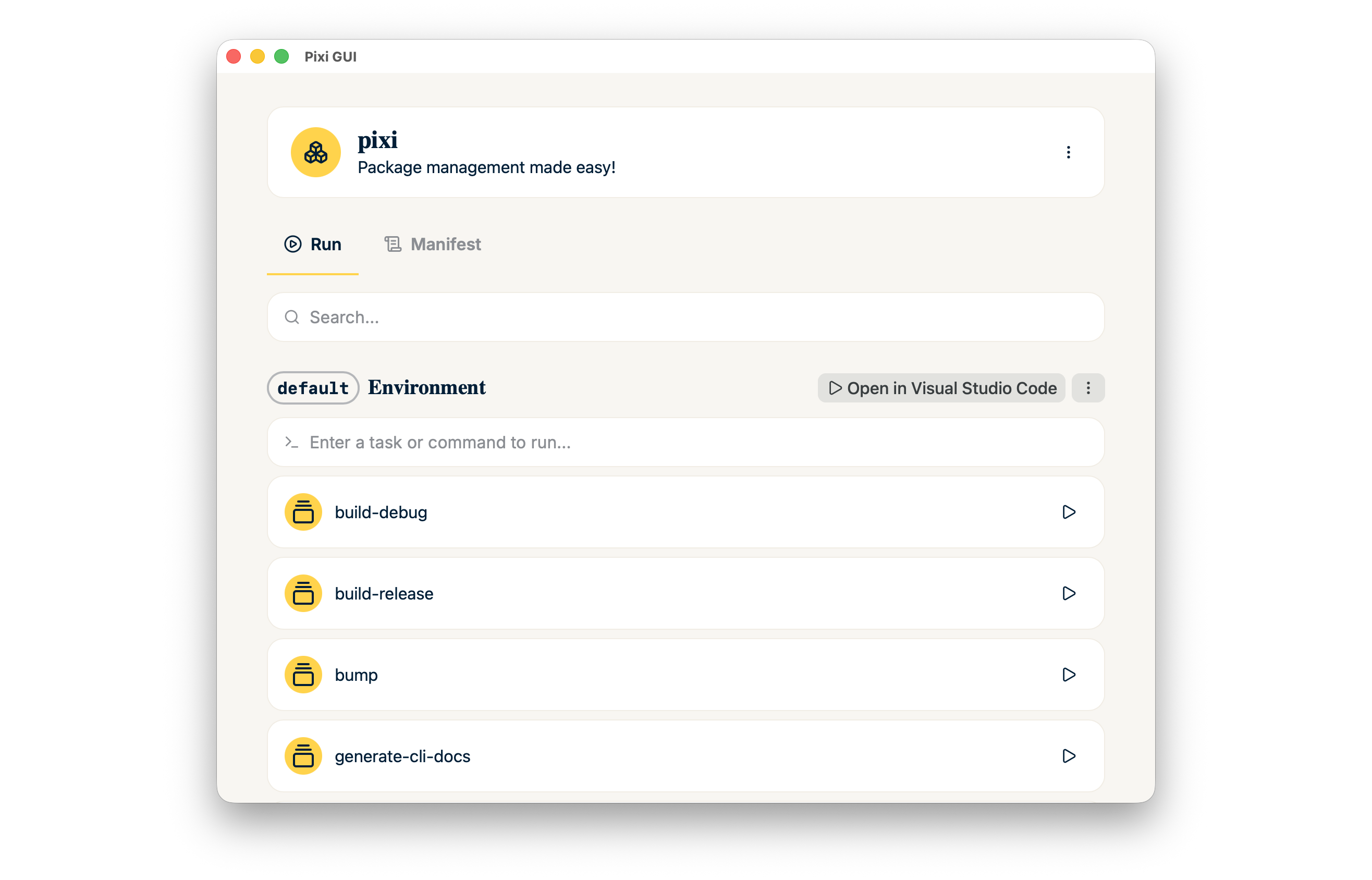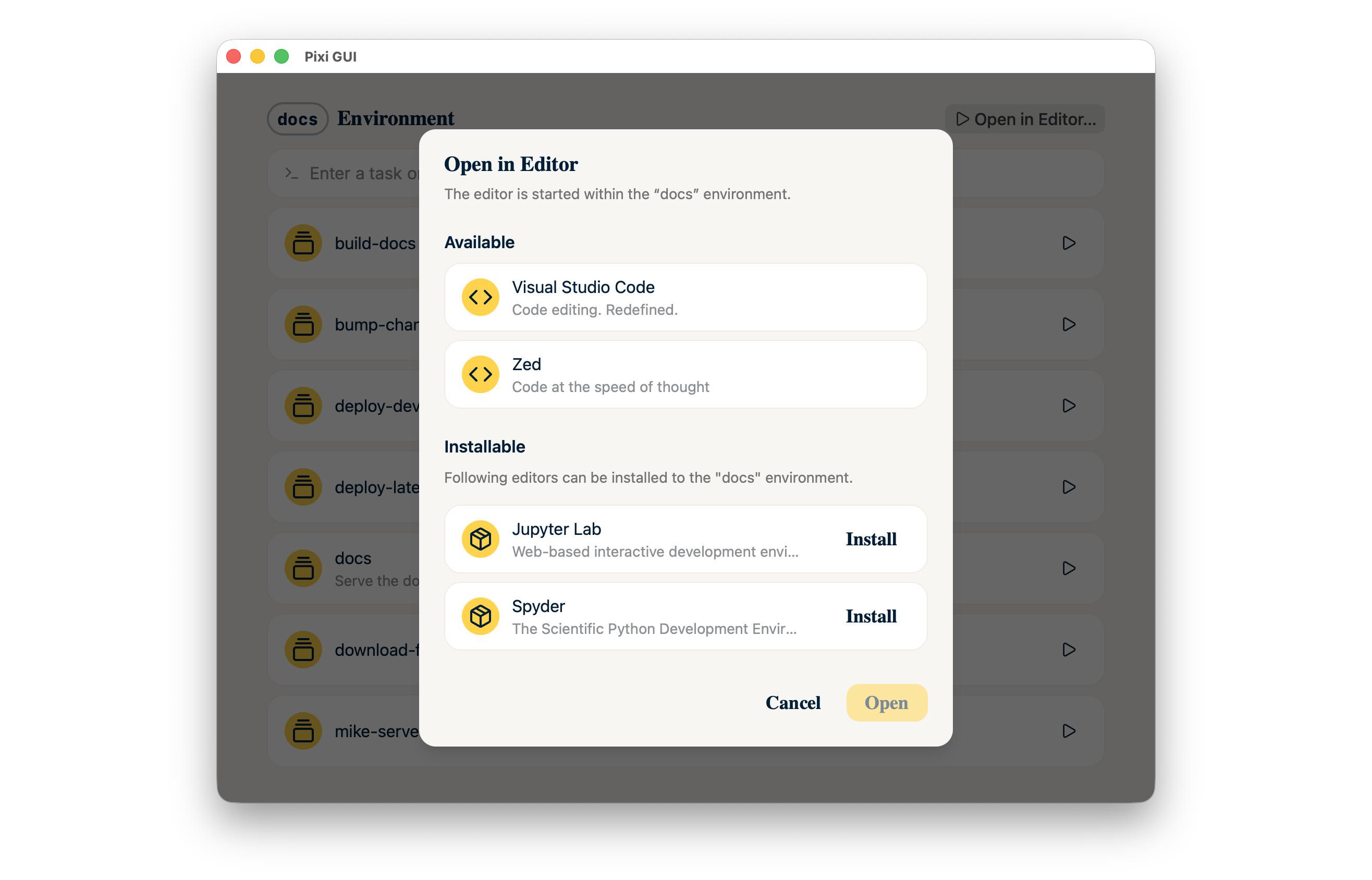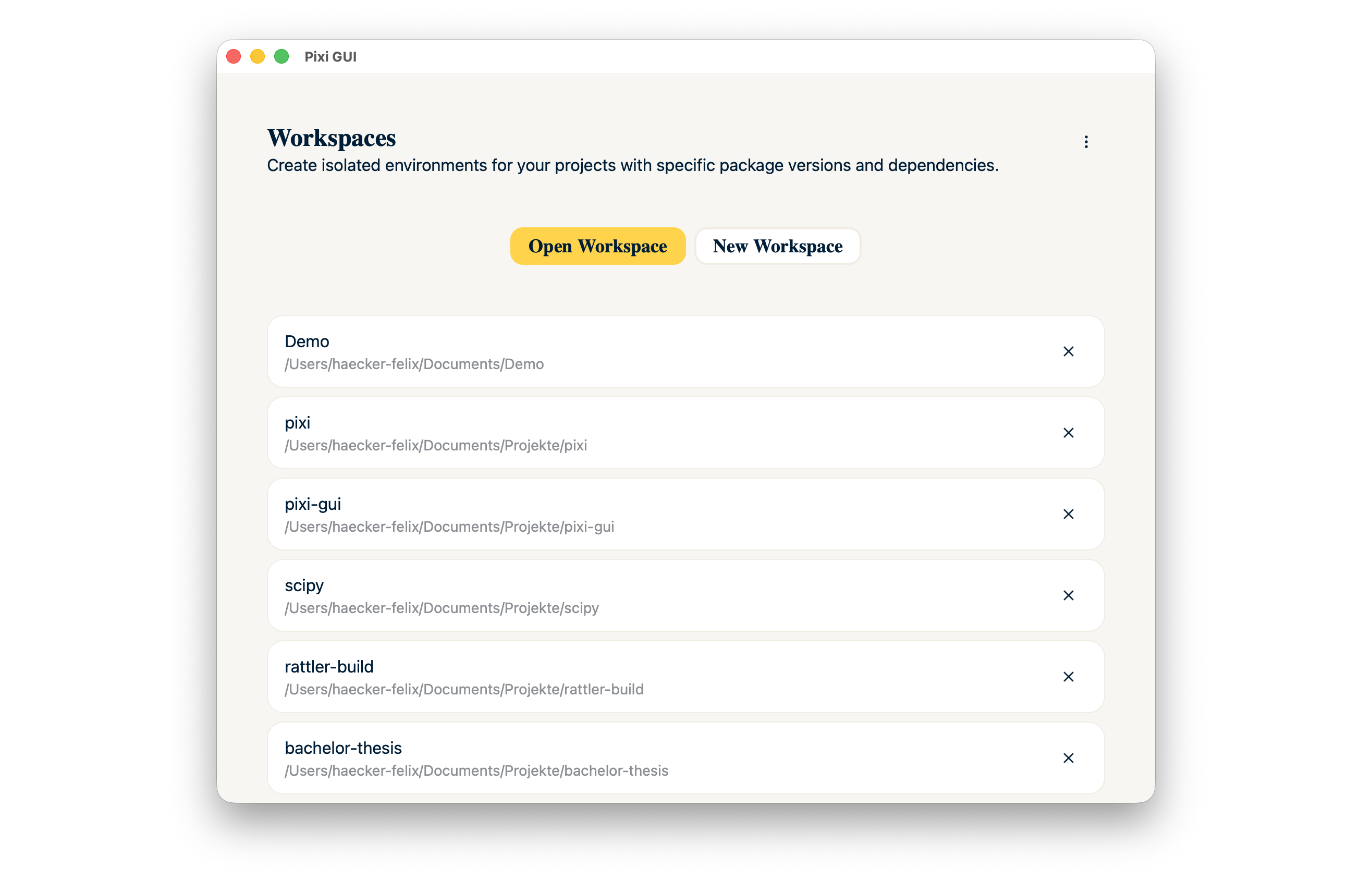 But also for experienced developers, a GUI can mean greater convenience. For me, for example, it's a huge-added value to be able to view all my Pixi workspaces in one place and start my preferred editor in an activated environment with a single click, without having to open a terminal.